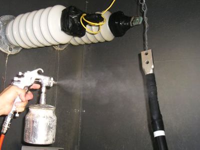 終端接続部や碍子などの表面に塩・との粉・水を混合した汚損液を塗布して電圧を加え、所定の電圧まで耐えることを確認、またはフラッシオーバー※電圧を測定する試験です。JECTECでは、等価霧中法で試験を実施致します。